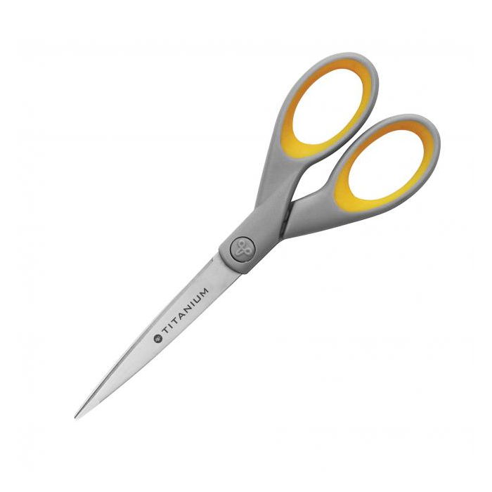 Nožnice z nerezovej ocele potiahuté vrstvou titánu, precízne ostrie pre dlhotrvajúcu ostrosť. Rukoväť s jemným pogumovaním pre komfor pri strihaní. Farba žltá / sivá. Záruka 25 rokov. Väčšie balenie 6 ks.