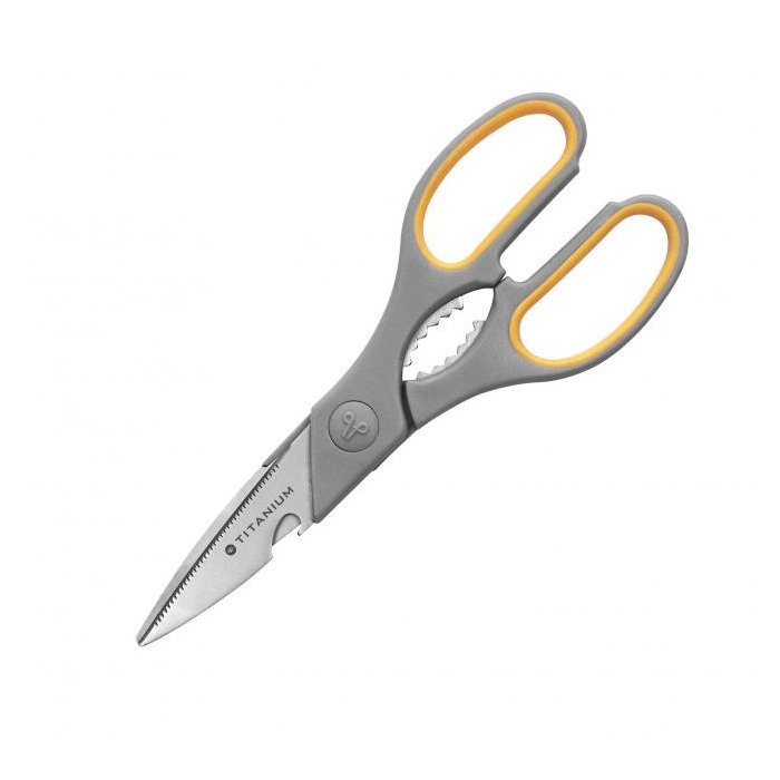 Multifunkčné nožnice s jemnou rukoväťou a strihacou časťou z nehrdzavejúcej ocele, s titaniovou povrchovou úpravou. 3 x tvrdšie než nehrdzavejúca oceľ. Veľkosť: 21 cm.