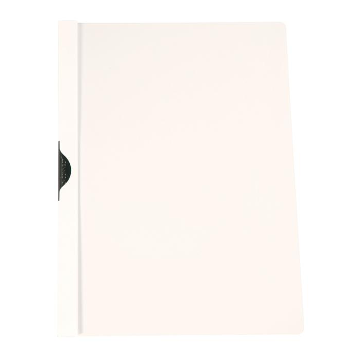 Obal z pevného polypropylénu s priehľadnou prednou stranou a kovovým vyklápacím klipom v čiernej farbe. Formát A4. Kapacita 1 - 30 listov. Väčšie balenie 25 ks. Farba biela.