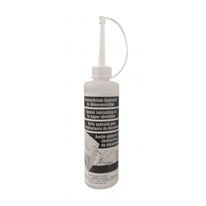 Údržba skartovacích zariadení najmä s priečnym rezom spočíva v pravidelnom olejovaní rezacej jednotky špeciálnym olejom.Objem: 250 ml