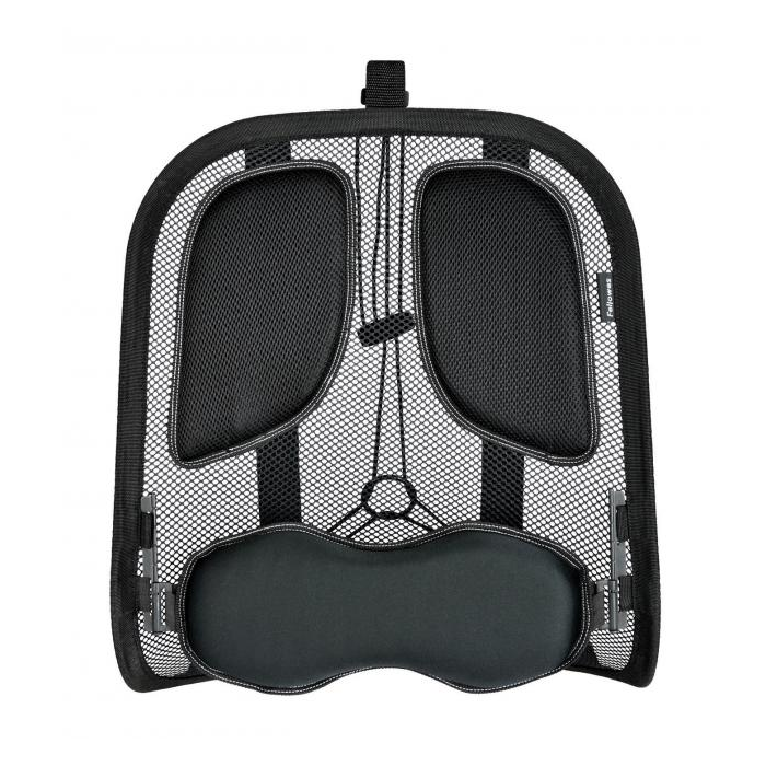 Opierka chrbta s vertikálne nastaviteľnou bedrovou opierkou pamäťovej peny na zníženie napätia chrbta. Tri napínacie nadstavce eliminujú potrebu opätovného nastavenia. Opierka jemne kopíruje obrysy chrbta, sieťovaná látka zabezpečuje vetranie miesta dotyku s chrbtom. Použiteľná na ľubovoľnú stoličku.Farba čierna.