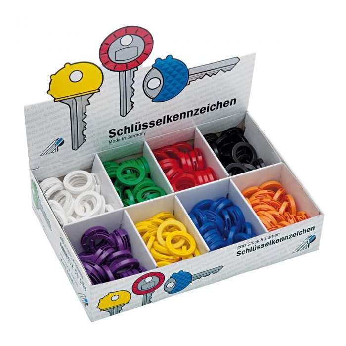 Farebné plastové krúžky na identifikáciu kľúčov podľa farieb. Priemer krúžka 24 mm. Dodávané s displeji s 200 ks v 8 farbách.