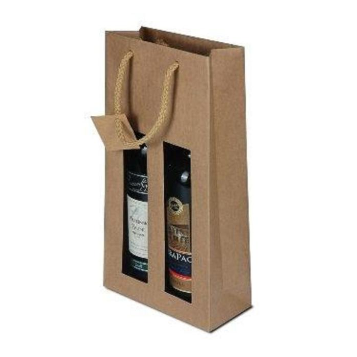 Papierová taška na 2 fľašky vína s okienkami. Taška má bavlnené ušká na nesenie. Ideálne riešenie na darčekové balenie. Farba hnedá.