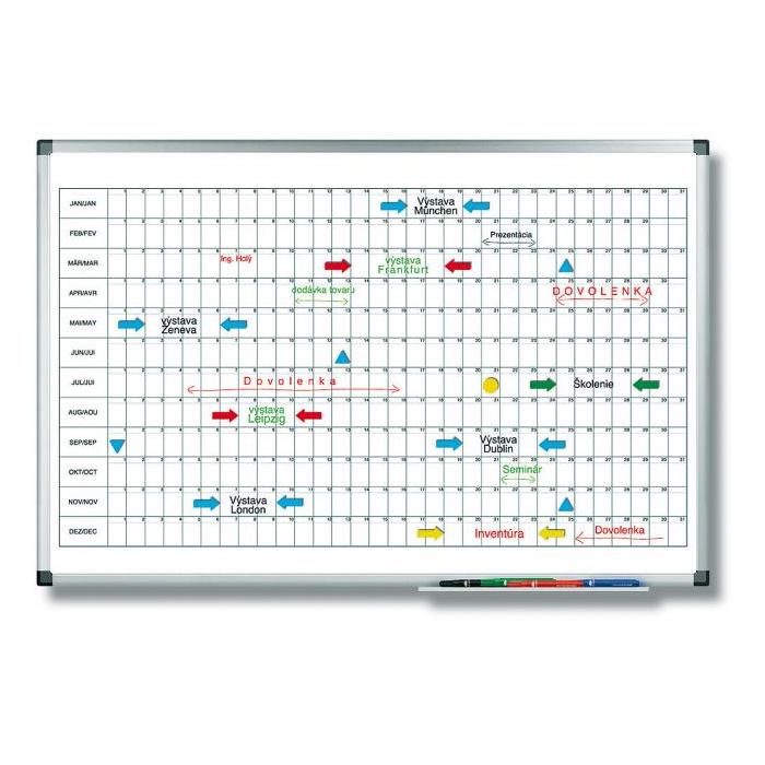 Tabuľa s popisovateľným magnetickým a špeciálne lakovaným a UV tvrdeným povrchom vo verzii ročného plánovača s názvami mesiacov dole po strane (`kalendárový` štýl). Ideálna ako `personálny plánovač`. Magnetický povrch. Sada príslušenstva zahrňuje 4 stierateľné popisovače TZ 111 a 20 mm magnetické symboly.