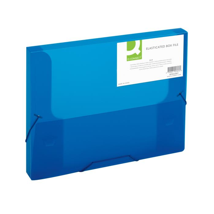 Transparentný plastový box s tromi chlopňami vyrobený z polypropylénu, uzatvárateľný gumičkou. Kapacita 250 listov, šírka chrbta 25 mm. Farba modrá.
