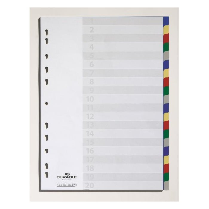 Farebný rozraďovač z polypropylénu s 20 oddielmi bez popisu. Formát A4, eurodierovanie, popisovateľný papierový titulný list na ľahkú orientáciu v dokumentoch. Balenie jedna sada v polyesterovom sáčku. Väčšie balenie 20 sád. Farba: 4x5 farieb Formát: A4