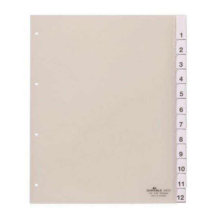 Polypropylénový rozraďovač s výmennými indexami vhodný na rozlíšenie zakladacích obalov. Formát A4 maxi, eurodierovanie, bez titulného listu. Súčasťou balenia sú náhradné výmenné indexy s mesiacmi JAN----DEZ. Balenie jedna sada v polyesterovom sáčku. Väčšie balenie 20 sád. Farba priehľadná. Farba: priehľadná Formát: A4 maxi Súčasťou: výmenné indexy JAN-DEZ