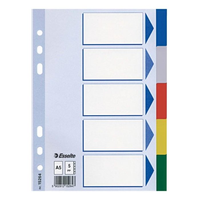 5-dielny plastový farebný rozraďovač. Euro-dierovanie, titulný popisovateľný list. Formát A5. Balenie jedna sada v polyesterovom sáčku. V kartóne 20 sád.