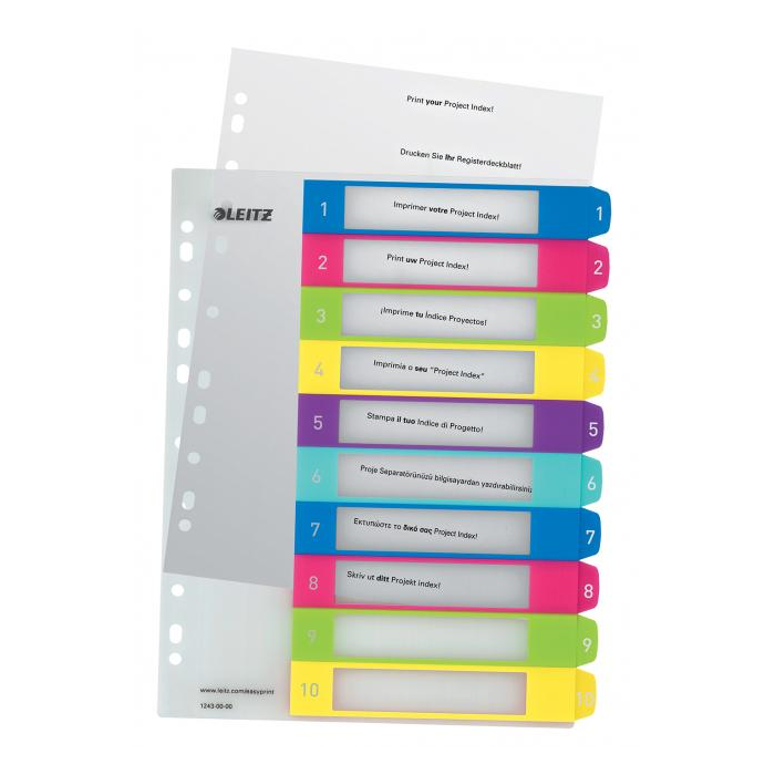 Opakovane použiteľný a extra odolný plastový číselný rozraďovač 1 - 10 v žiarivých farebných kombináciách s univerzálnou perforáciou. Materiál odolný polypropylén hrúbky 0,3 mm. Formát A4 maxi. Možnosť potlače na upravenie podľa vlastných potrieb, predloha stiahnuteľná zdarma na www.esselte.com/ easyprint.