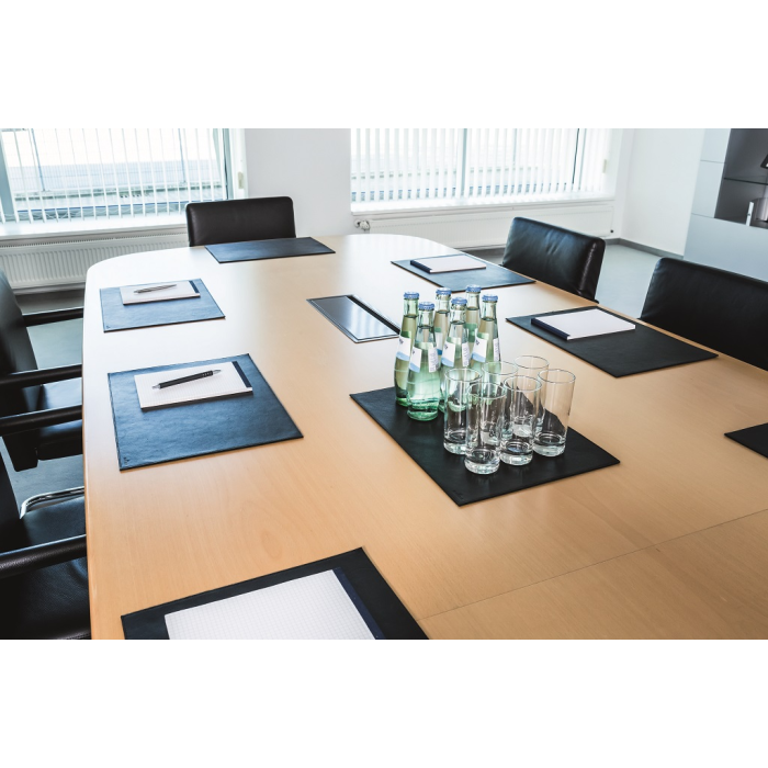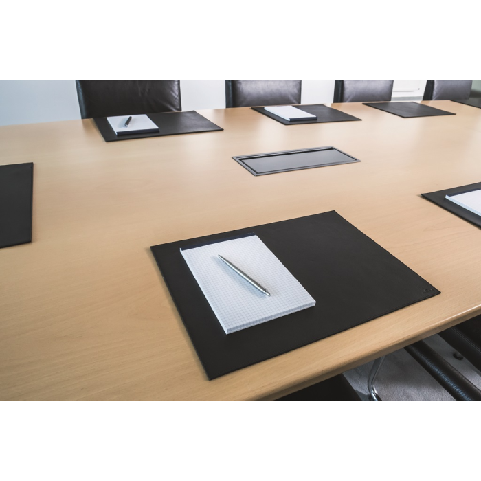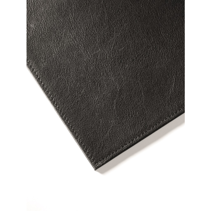 Podložka na stôl vysokej kvality vyrobená z najjemnejšej zrnitej kože. Ručná výroba, prešívaný lem, zadná strana z vysokokvalitného fleesu. Rozmery 42 × 30 cm. Farba čierna.