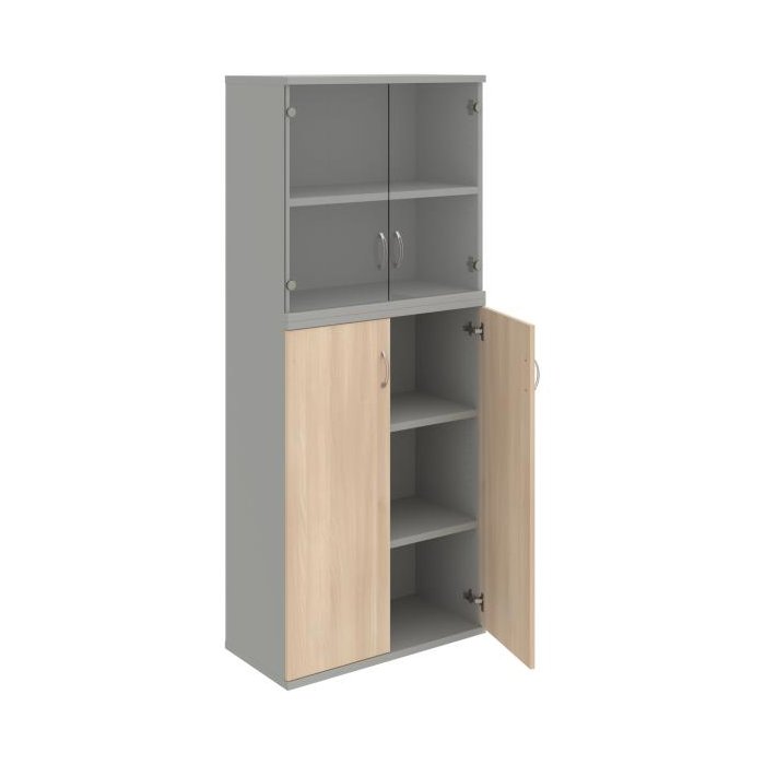 Kombinovaná skriňa - dvere/nika. Kancelárske skrine STRONG majú robustnú konštrukciu a vyššiu nosnosť políc ako bežné kancelárske skrine.V ponuke sú skriňové moduly s výškou 185 cm, 111 cm alebo 74 cm a šírky 80 cm alebo 40 cm. Hĺbka všetkých modelov skriňového radu STRONG je 40 cm.Chrbát, vyrobený z 8 mm hrubých dosák, je obojstranne pohľadový, takže skrine môžete použiť ako priestorový deliaci prvok. Hrúbka samotných políc je 25 mm, čo znamená nosnosť 80 kg na 1 policu.Korpusy, dvierka a police skríň sú olepené odolnou 2mm ABS hranou, ktorá garantuje dostatočnú ochranu proti poškodeniu.