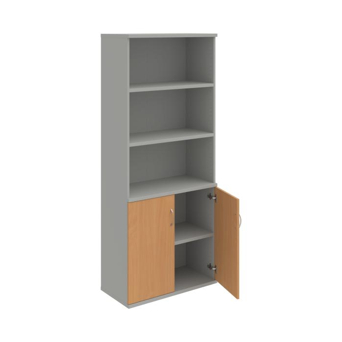 Kombinovaná skriňa - dvere/nika. Kancelárske skrine STRONG majú robustnú konštrukciu a vyššiu nosnosť políc ako bežné kancelárske skrine.V ponuke sú skriňové moduly s výškou 185 cm, 111 cm alebo 74 cm a šírky 80 cm alebo 40 cm.Hĺbka všetkých modelov skriňového radu STRONG je 40 cm.Chrbát, vyrobený z 8 mm hrubých dosák, je obojstranne pohľadový, takže skrine môžete použiť ako priestorový deliaci prvok. Hrúbka samotných políc je 25 mm, čo znamená nosnosť 80 kg na 1 policu.Korpusy, dvierka a police skríň sú olepené odolnou 2mm ABS hranou, ktorá garantuje dostatočnú ochranu proti poškodeniu.
