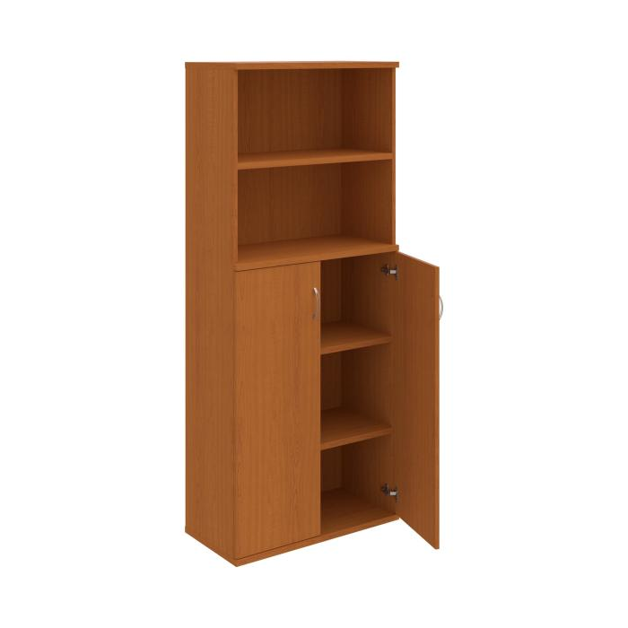 Kombinovaná skriňa - dvere/nika. Kancelárske skrine STRONG majú robustnú konštrukciu a vyššiu nosnosť políc ako bežné kancelárske skrine.V ponuke sú skriňové moduly s výškou 185 cm, 111 cm alebo 74 cm a šírky 80 cm alebo 40 cm.Hĺbka všetkých modelov skriňového radu STRONG je 40 cm.Chrbát, vyrobený z 8 mm hrubých dosák, je obojstranne pohľadový, takže skrine môžete použiť ako priestorový deliaci prvok. Hrúbka samotných políc je 25 mm, čo znamená nosnosť 80 kg na 1 policu.Korpusy, dvierka a police skríň sú olepené odolnou 2mm ABS hranou, ktorá garantuje dostatočnú ochranu proti poškodeniu.