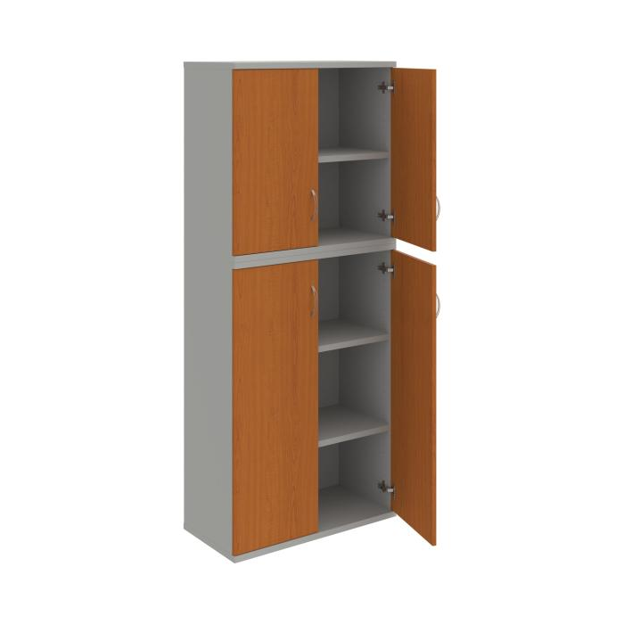Kombinovaná skriňa - dvere/nika. Kancelárske skrine STRONG majú robustnú konštrukciu a vyššiu nosnosť políc ako bežné kancelárske skrine.V ponuke sú skriňové moduly s výškou 185 cm, 111 cm alebo 74 cm a šírky 80 cm alebo 40 cm. Hĺbka všetkých modelov skriňového radu STRONG je 40 cm.Chrbát, vyrobený z 8 mm hrubých dosák, je obojstranne pohľadový, takže skrine môžete použiť ako priestorový deliaci prvok. Hrúbka samotných políc je 25 mm, čo znamená nosnosť 80 kg na 1 policu.Korpusy, dvierka a police skríň sú olepené odolnou 2mm ABS hranou, ktorá garantuje dostatočnú ochranu proti poškodeniu.