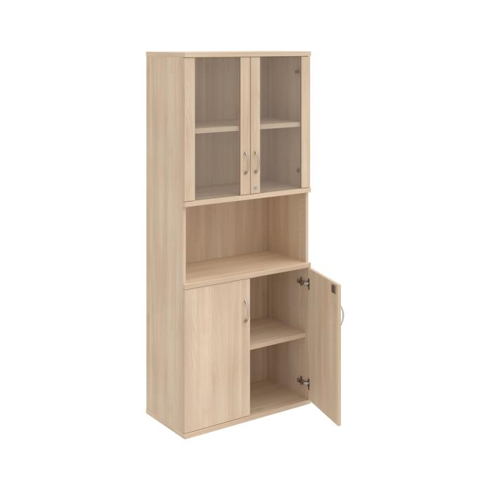 Kombinovaná skriňa - dvere/nika. Kancelárske skrine STRONG majú robustnú konštrukciu a vyššiu nosnosť políc ako bežné kancelárske skrine.V ponuke sú skriňové moduly s výškou 185 cm, 111 cm alebo 74 cm a šírky 80 cm alebo 40 cm. Hĺbka všetkých modelov skriňového radu STRONG je 40 cm.Chrbát, vyrobený z 8 mm hrubých dosák, je obojstranne pohľadový, takže skrine môžete použiť ako priestorový deliaci prvok. Hrúbka samotných políc je 25 mm, čo znamená nosnosť 80 kg na 1 policu.Korpusy, dvierka a police skríň sú olepené odolnou 2mm ABS hranou, ktorá garantuje dostatočnú ochranu proti poškodeniu.