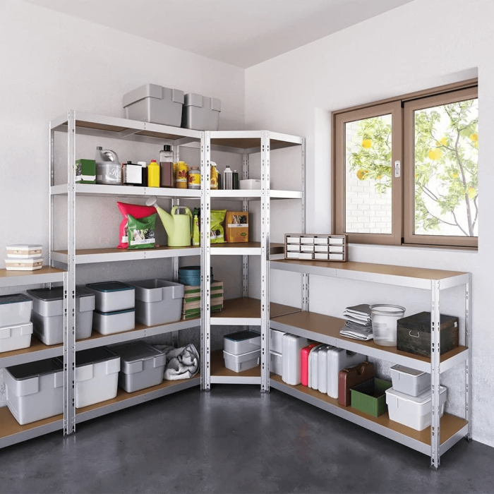 Odolný rohový kovový regál s vysokou nosnosťou s HDF doskami je ideálnym riešením pre náročné domáce aj priemyselné použitie.
