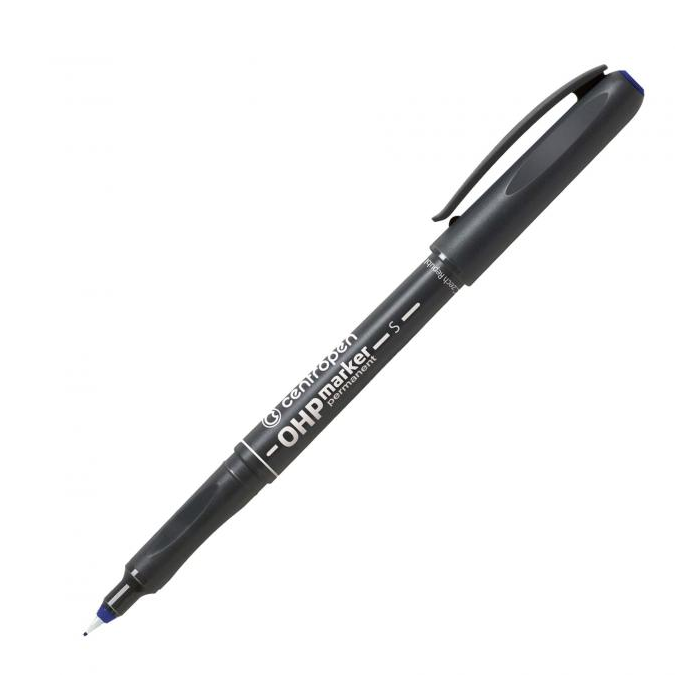 Permanentné popisovače na alkoholovej báze s ergo držaním na popisovanie transparentných fólií do spätných projektorov, ale tiež na plastické hmoty, sklo a pod. Väčšie balenie 10 ks v jednej farbe. Hrot okrúhly, šírka stopy 0,3 - 0,4 mm. Farba modrá.