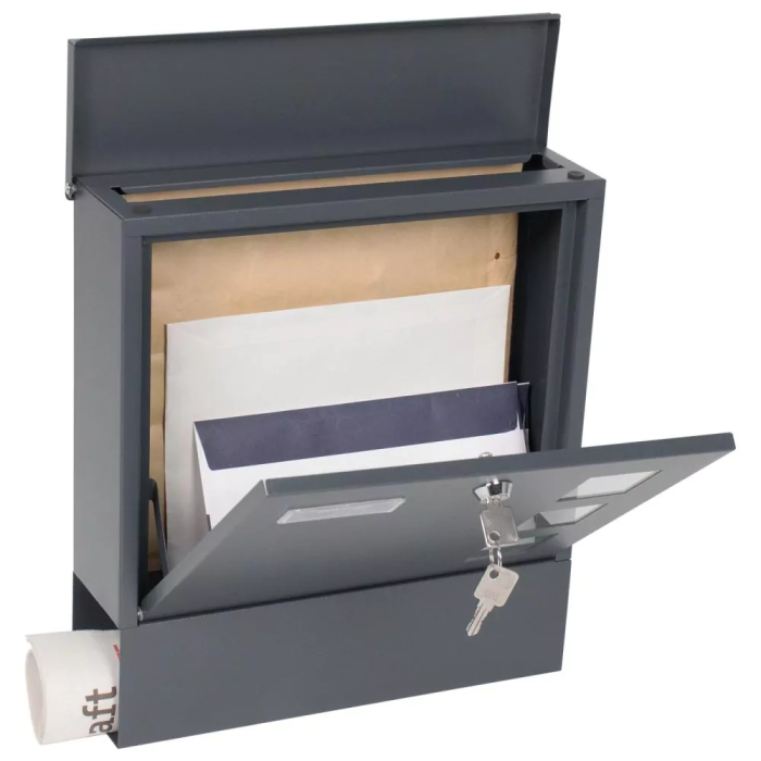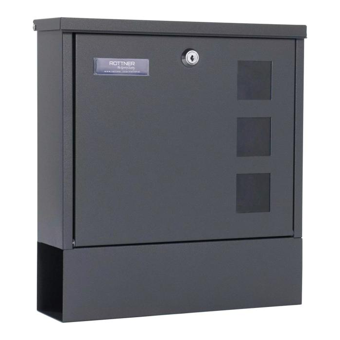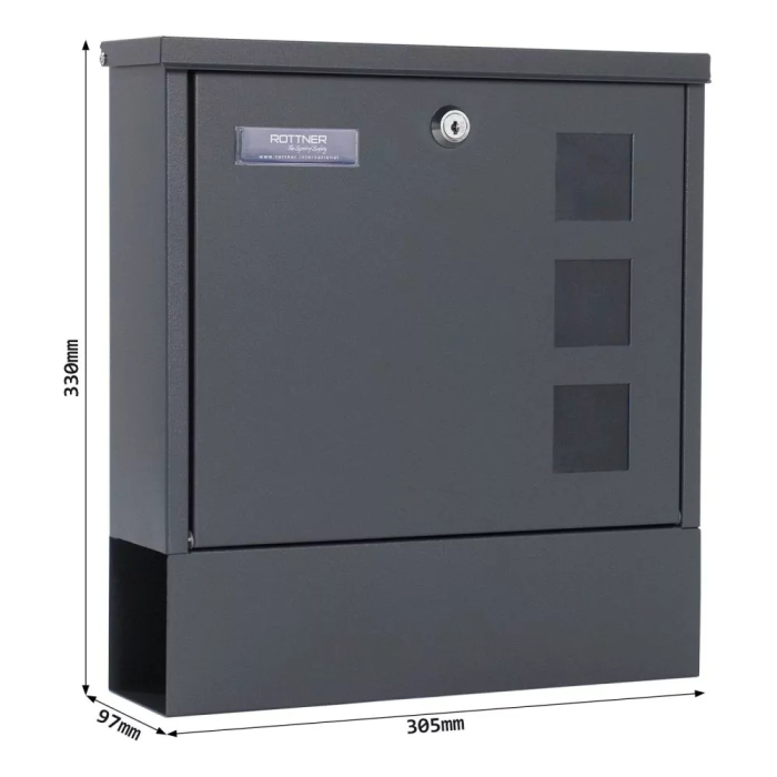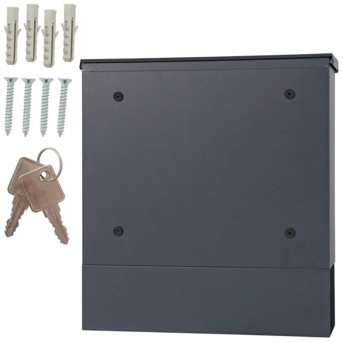 Antracitová poštová schránka Lago disponuje klasickým cylindrickým zámkom spolu s 2 kľúčmi. Poštová schránka disponuje horným vhodom pre poštu do veľkosti max. A4. Horný vhod je chránený krytkou, aby do vnútra schránky nevnikala dažďová voda a iné nečistoty. Na predných dverách je pripravené miesto na menovku. Okrem menovky sa na prednej strane nachádzajú aj 3 priehľadné okienka. Spodná strana disponuje samostatným boxom na noviny a dennú tlač. Zadná strana má pripravené otvory na upevnenie. Materiál na upevnenie je súčasťou balenia.