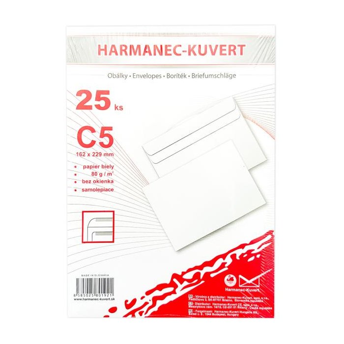 Biele obálky rozmeru 162 × 229 mm, vyrobené z bezdrevného papiera, 80 g/ m2. Samolepiace.