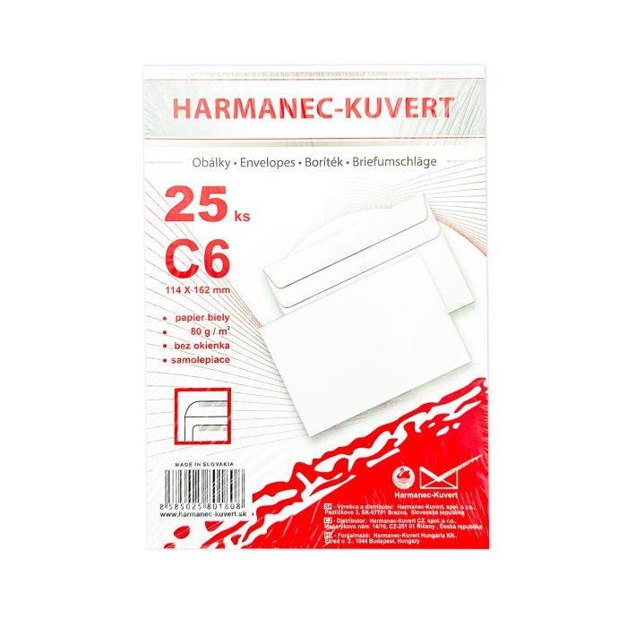 Biele obálky rozmeru 114 × 162 mm, vyrobené z bezdrevného papiera, 80 g/ m2. Samolepiace.