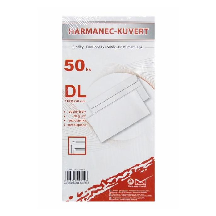 Biele samolepiace obálky rozmerov 110 × 220 mm, vyrobené z bezdrevného papiera, 80 g / m². Balenie 50 kusov.
