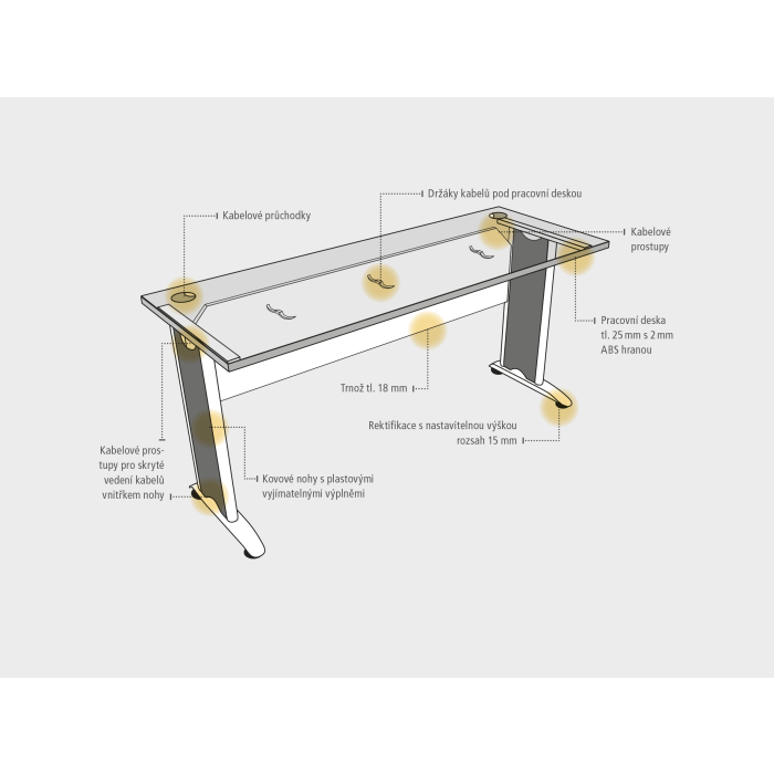 Samozrejmosťou je rektifikačný systém, ktorý v prípade nerovnej podlahy umožňuje výškové dorovnanie stola až o 1,5 cm. Nohy prepája 18mm hrubá laminovaná drevotriesková doska, ktorá zaisťuje stabilitu stola.