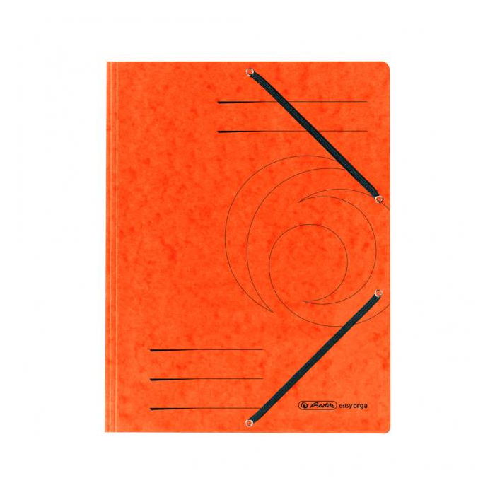 Obal A4 s tromi chlopňami a dvomi gumičkami čiernej farby. Materiál prešpánový kartón gramáže 355 g / m². Väčšie balenie 25 ks. Farba oranžová.