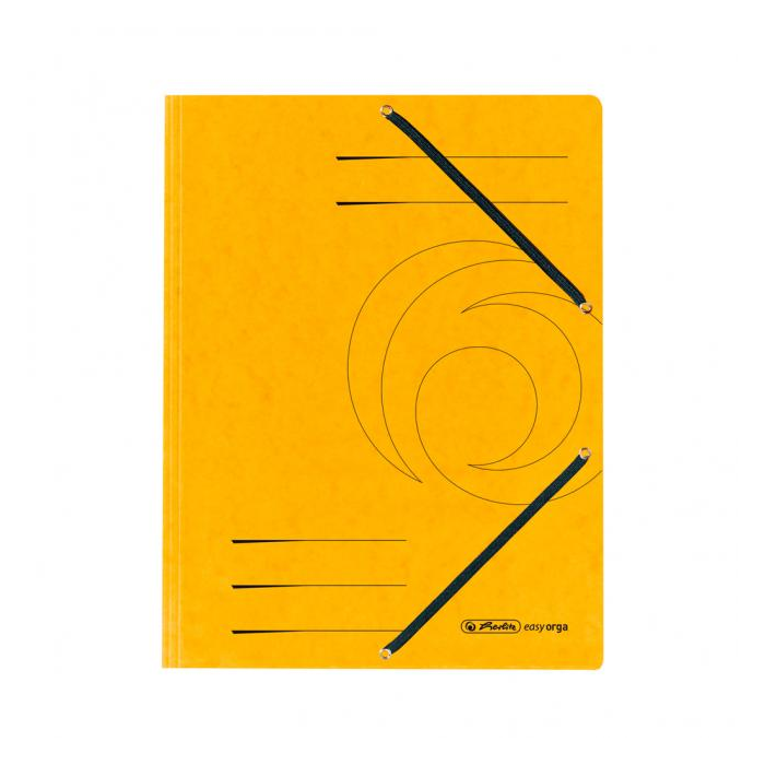 Obal A4 s tromi chlopňami a dvomi gumičkami čiernej farby. Materiál prešpánový kartón gramáže 355 g / m². Väčšie balenie 25 ks. Farba žltá.
