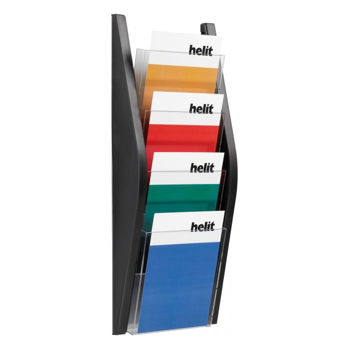 Nástenný stojan na prezentáciu materiálov. Štyri priehľadné priehradky slúžia na umiestnenie materiálov formátu A5. Materiál kvalitný plast. Rozmery (š x v x h) 215 x 540 x 80 mm. Farba čierna.