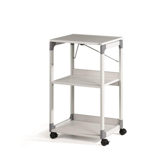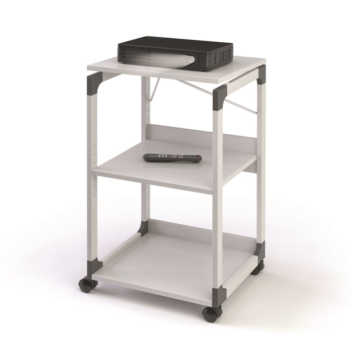 Mobilný projekčný vozík s tromi policami. Horná polica je odnímateľná a pri projekcii sa dá naklopiť do 180°, stredná polica je výškovo nastaviteľná po 32 mm, spodná polica je fixná. Hrúbka políc 19 mm. Materiál pevný kovový lakovaný rám s rohovými spojkami z plastu. Farba sivá. Rozmery š × v × h 508 x 882 x 432 mm.