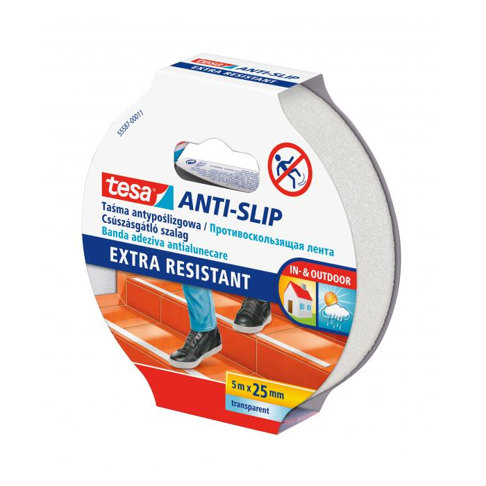 Protišmyková páska tesa® je účinným prostriedkom na prevenciu pádov na kritických miestach, ako sú schodové rohožky, rampy, klzké podlahy alebo paluby. Táto páska nielenže zaisťuje veľmi silnú priľnavosť, je tiež odolná voči UV žiareniu a vode, extrémnym teplotám a čistiacim prostriedkom. Bezpečne sa prilepí k akémukoľvek klzkému povrchu zbavenému nečistôt, oleja a mastnoty. Rozmery 25 mm × 5 m. Farba transparentná.