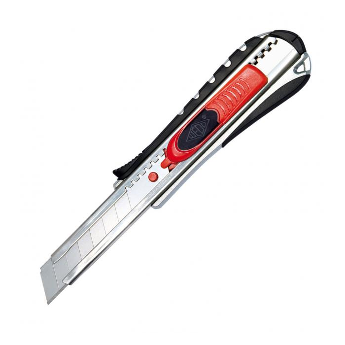 Kovové rezače s gumenou zónou, integrovaným odlamovačom čepele s funkciami štandardného a bezpečnostného rezača. Po ukončení rezu alebo v prípade, keď sa ostrie kĺže po rezanom materiáli, sa čepeľ automaticky zasunie. Čepeľ možno vysúvať aj pomocou integrovaného bežca. Šírka čepele 18 mm. Schválené inštitútom TÜV. Farba červená/ čierna.