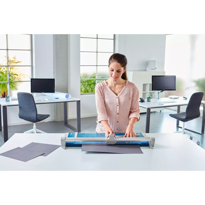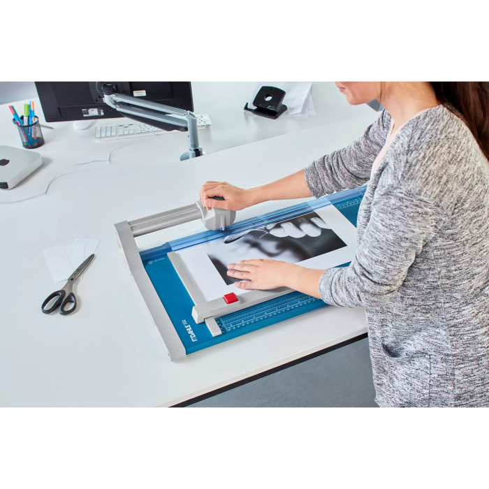 Profesionálna rezačka s kovovou základňou a presným rezom na grafické účely (filmy, fólie, papier). Kruhový nôž umiestnený v plastovom ochrannom kryte sa automaticky brúsi pri rezaní o protinôž - oba nože z tvrdenej ocele. Automatický prítlak pohybom rezacej hlavy, zadný doraz. Mierka v cm/inch. Na pracovnom stole sú vyznačené formáty DIN. Možnosť montáže na stenu.