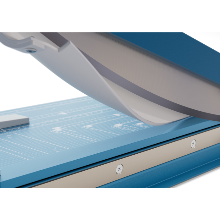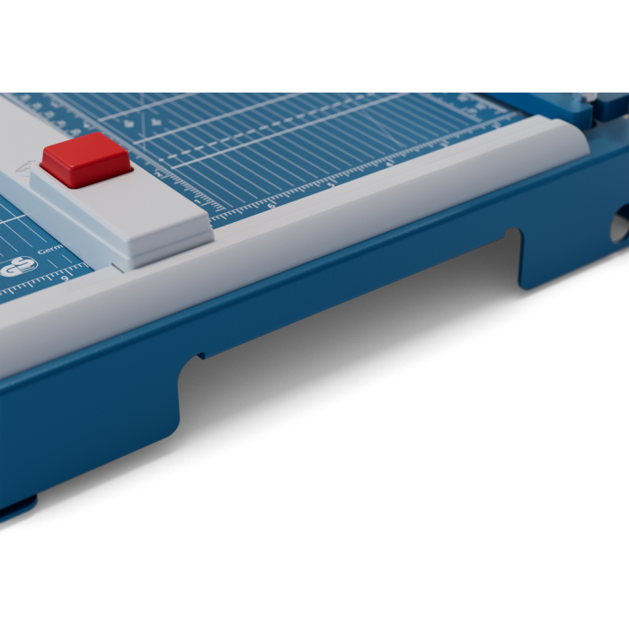Páková rezačka z pevného oceľového plechu. Základný vrchný a základný spodný brúsený nôž vyrobený z kvalitnej nožiarskej ocele Solingen. Rotujúci kryt okolo ostria chráni prsty pred náhodným porezaním. Presná mierka v cm/inch a DIN formátoch. Automatický prítlak. Model s výrezmi na pohodlné prenášanie.