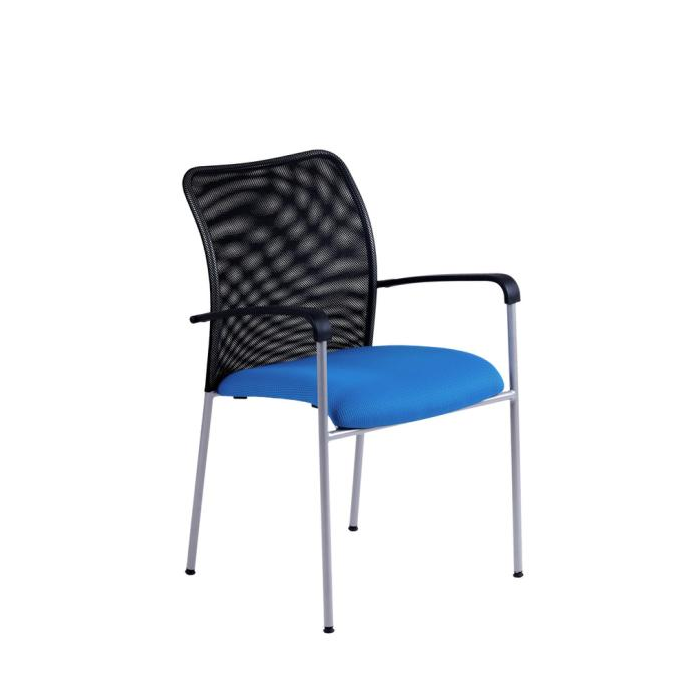 Rokovacia čalúnená stolička so sieťovinovým operadlom.