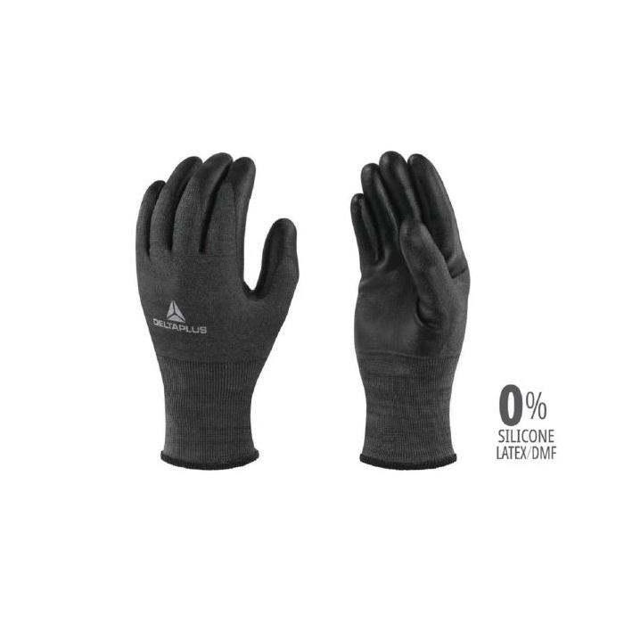 Pletené antistatické rukavice, materiál DELTAnocut® vysoko odolné vlákno a uhlíkové vlákno, dlaň a konce prstov povrstvené polyuretánom bez rozpúštadiel. Hrúbka úpletu 18.
