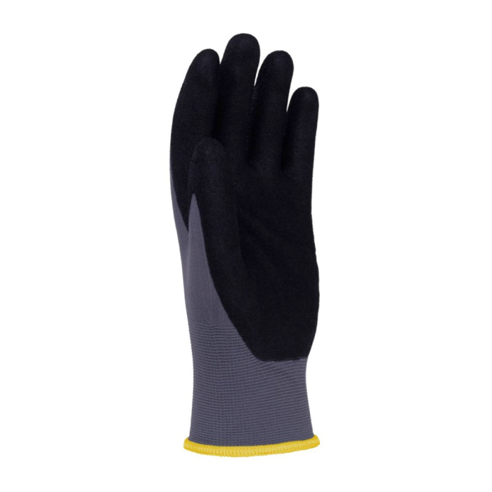 rukavice z kvalitnej pletenej nylonovej tkaniny s elastanom v šedej farbe, v úchopovej časti potiahnuté ultra jemnou nitrilovou penou čiernej farby