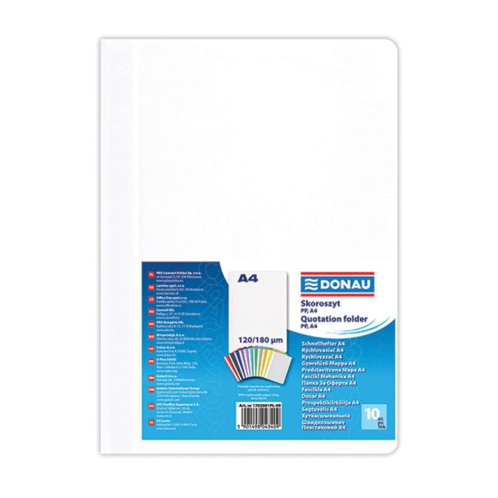 Štandardný polypropylénový rýchloviazač s priehľadnou prednou stranou a nasúvacím popisným pásikom. Formát A4. Balenie 10 ks.