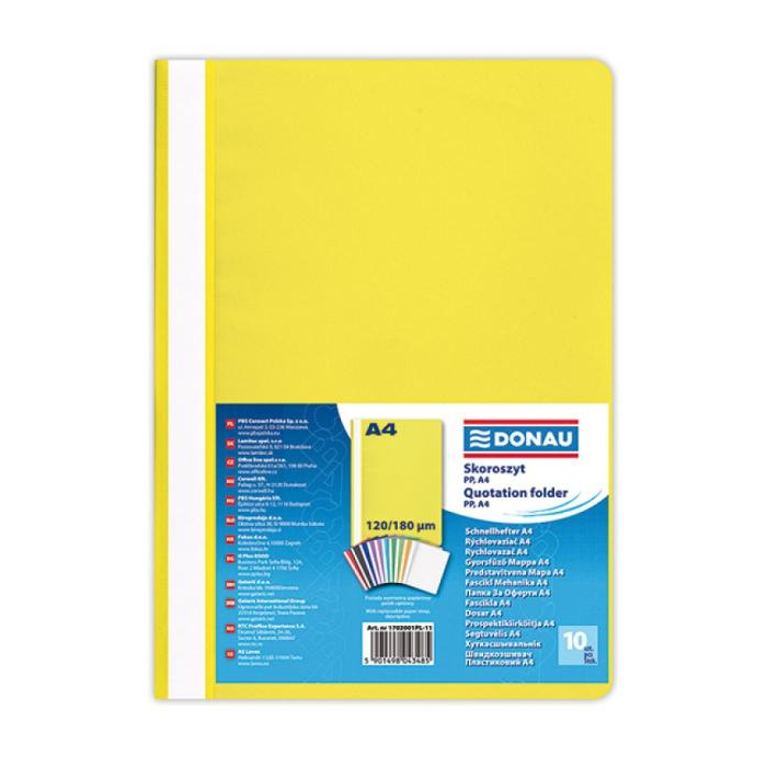 Štandardný polypropylénový rýchloviazač s priehľadnou prednou stranou a nasúvacím popisným pásikom. Formát A4. Balenie 10 ks.