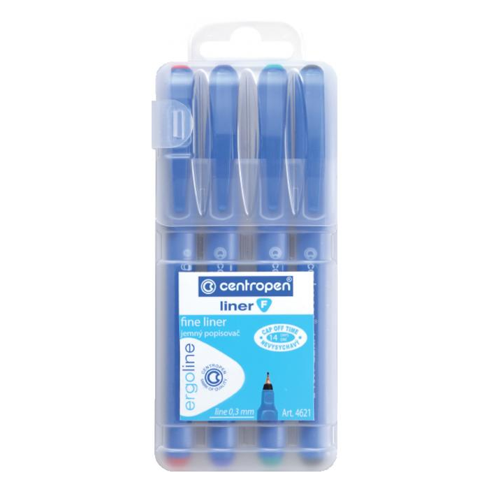 Jednorazový liner v novom dizajne s jemným plastovým hrotom v kovovej objímke. Plnený nevysychajúcim atramentom, vďaka ktorému liner vydrží až 14 dní bez vrchnáka. Šírka stopy 0,3 mm, dĺžka stopy 1 500 m. Sada 4 základných farieb.