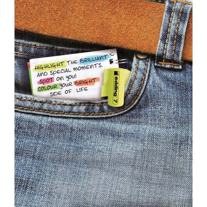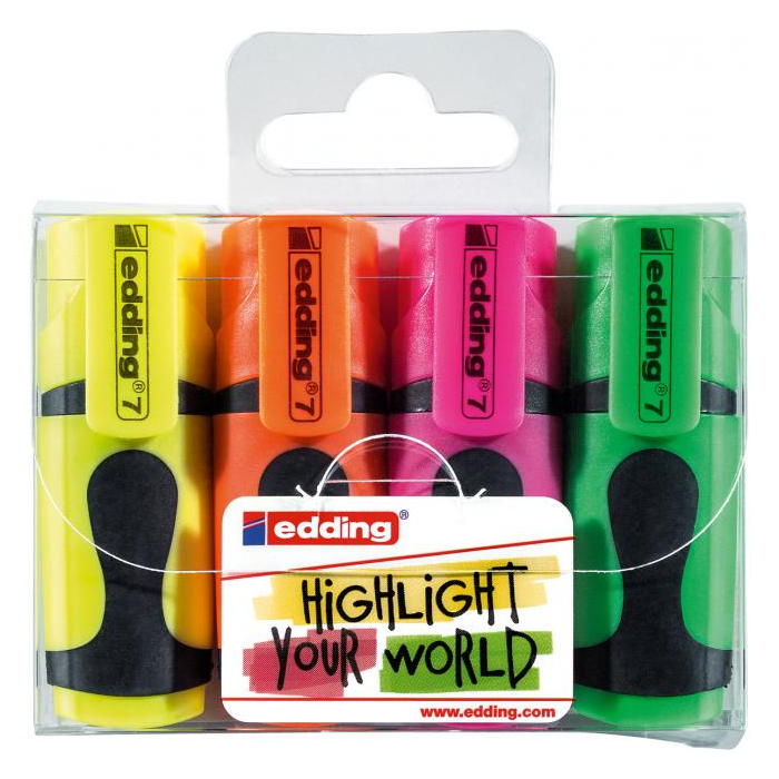 4 kusová sada mini zvýrazňovačov edding so zrezaným hrotom so šírkou stopy 1 - 3 mm. Neónový pigment s maximálnym jasom, protišmyková ergonomická rukoväť. Uzáver s klipom. Väčšie balenie 10 ks v jednej farbe. Balenie sada 4 kusov.