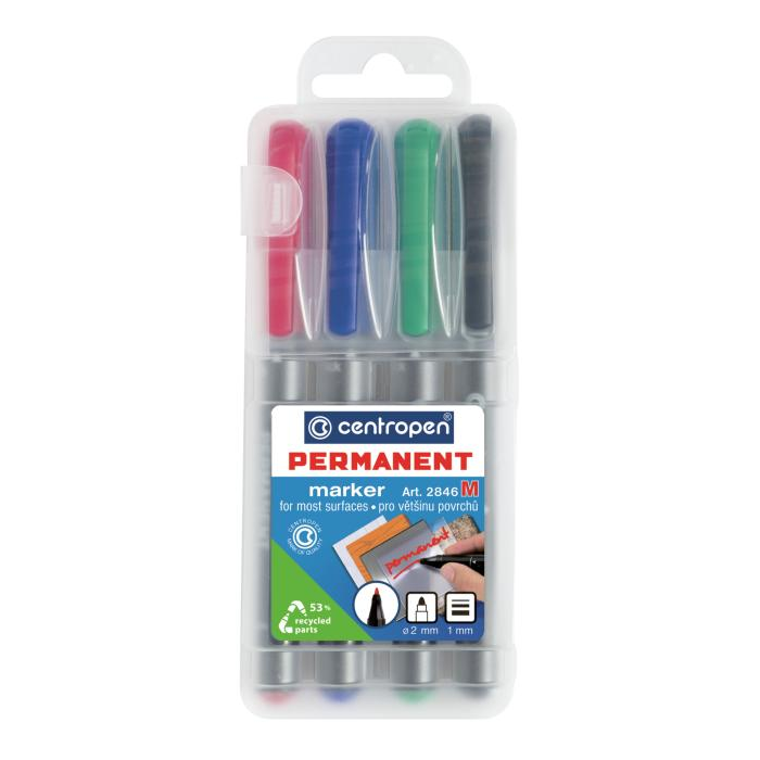 Sada 4 ks permanentných popisovačov s atramentom na alkoholovej báze a vláknovým hrotom. Popisovače vhodné na plastické hmoty, sklo, filmy a pod. Šírka stopy 1 mm. Farba: sada 4 ks Šírka stopy: 1 mm Typ hrotu: vláknový