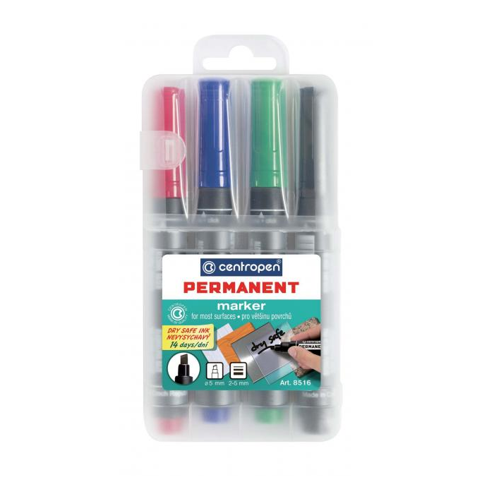 Permanentný popisovač, ktorý vďaka svojej špeciálnej atramentovej náplni vydrží aj 14 dní otvorený a nevyschne. Píše na papier, kartón, drevo, kov, umelú hmotu, sklo, porcelán a kameň. Permanentný atrament na alkoholovej báze. Stopa písma odolná voči vode, teplote do 100 °C, oteru a poveternostným vplyvom. Klinový hrot, šírka stopy 2-5 mm. Atrament na alkoholovej báze. Sada 4ks.