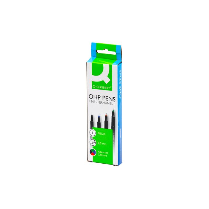 Permanentný popisovač Q-Connect OHP, rýchloschnúci. Jemný plastový hrot s 0,5 mm šírkou písma permanentným atramentom. Sada 4 farieb.