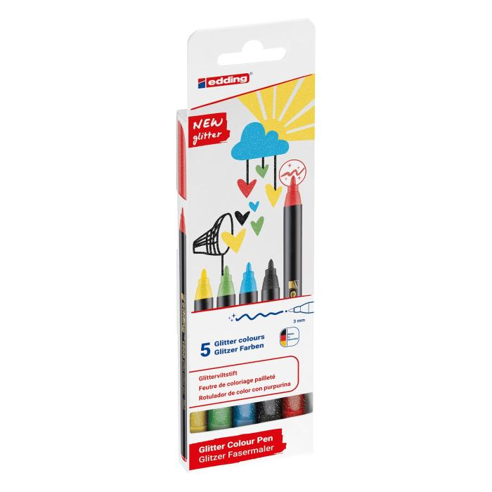 Farebný popisovač s atraktívnym trblietavým atramentom na písanie, dekorovanie, vyfarbovanie, kreslenie a rozvrhovanie na svetlom papieri. Šírka stopy okrúhleho hrotu je 3 mm. Atrament na vodnej báze vo filtračnom systéme je rýchloschnúci a má slabý zápach. Sada obsahuje farby žltý gliter, červený gliter, azúrovo modrý gliter, svetlozelený gliter a čierny gliter.