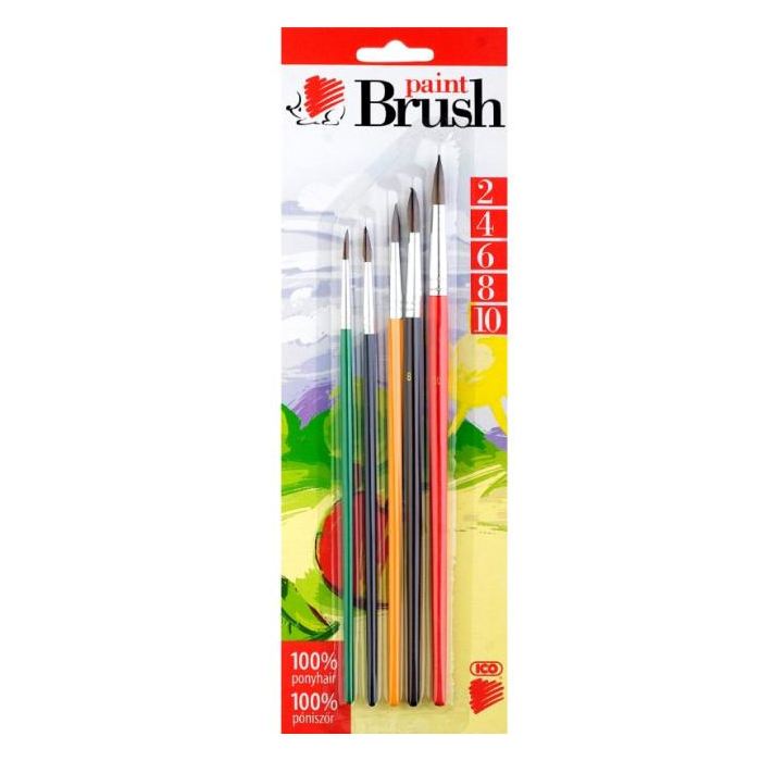 5 kusová sada guľatých školských štetcov s farebnou rúčkou. Štetina 100% poník. Ideálne na maľovanie vodovými farbami. Šírka štetiny 2-4-6-8-10 mm.
