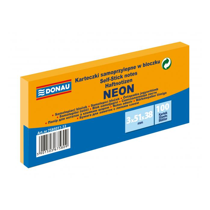 Univerzálne neónové samolepiace bločky z papiera gramáže 70 g / m², 100-lístkové, jednotlivo balené. Lepidlo nanesené po dlhšej strane, zmývateľné vodou. Udelený Green Point. 3 bločky vo fólii s červeným pruhom na uľahčenie otvárania. Väčšie balenie 36 ks. Farba neónovo oranžová.
