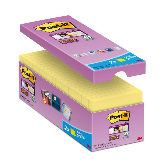 Post‑it® Super Sticky vo zvýhodnenom balení. Žlté bločky so super silným lepidlom, ktoré drží pevnejšie než kedykoľvek predtým. Rozmery 76 x 76 mm. Počet lístkov 16 x 90.
