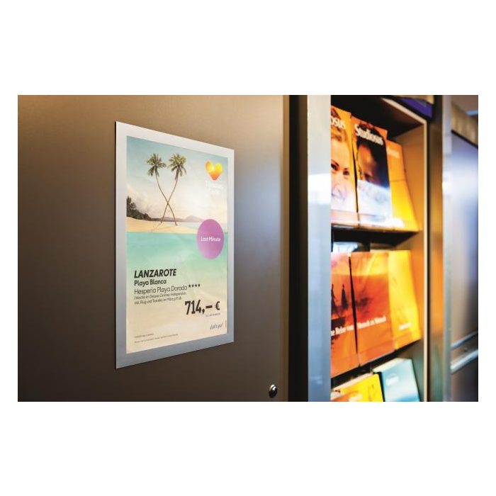 Samolepiaci informačný panel s prednou magnetickou časťou. Ideálny na vystavovanie plagátov, kľúčových informácií, špeciálnych oznamov alebo dôležitých čísel. Informácie sa ľahko vymieňajú a sú čitateľné z oboch strán, ak sa panel umiestni napr. na okno alebo priehľadné dvere. Vhodný na hladké a pevné povrchy. V prípade potreby je ľahko premiestniteľný bez potreby vŕtania. Formát A4, rámik strieborný. Balenie 10 ks.