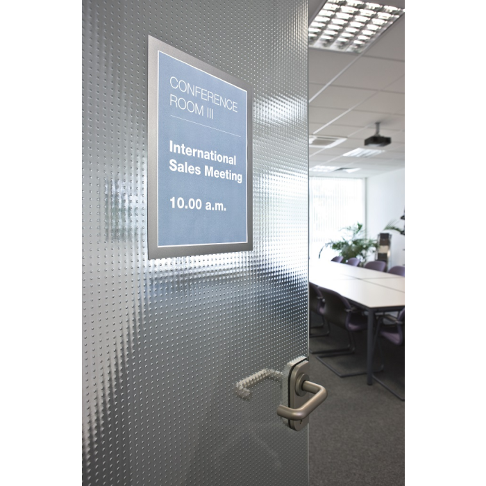 Samolepiaci informačný panel s prednou magnetickou časťou. Ideálny na vystavovanie plagátov, kľúčových informácií, špeciálnych oznamov alebo dôležitých čísel. Informácie sa ľahko vymieňajú a sú čitateľné z oboch strán, ak sa panel umiestni napr. na okno alebo priehľadné dvere. Vhodný na hladké a pevné povrchy. V prípade potreby je ľahko premiestniteľný bez potreby vŕtania. Formát A4, rámik strieborný.
